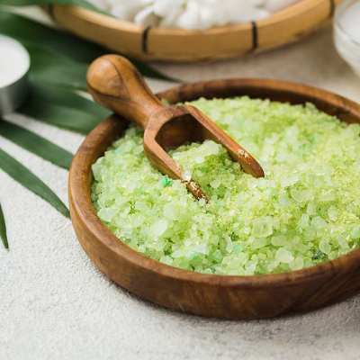 O sal de banho fino utilizado dessa forma atua como um esfoliante leve e, para esse fim, as pessoas com pele delicada devem usar o sal na bucha uma vez por semana e pessoas com pele normal até três vezes por semana.